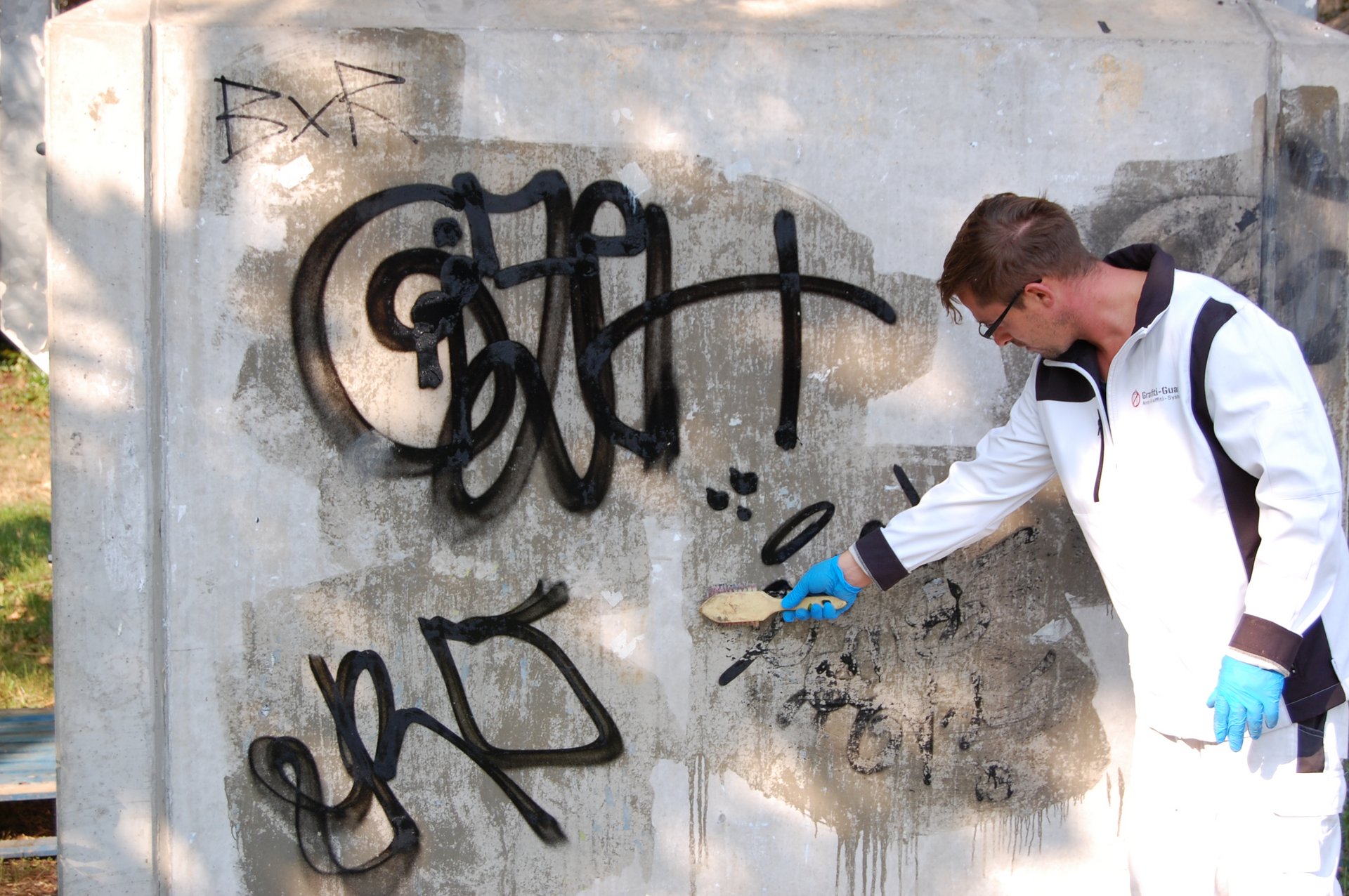 Bei allen Betonarten handelt es sich um einen porösen Untergrund, hier ist oft mehrfaches Schatten-Entfernen nötig, da Farbspray oder Markerfarbe tief in ungeschützten Untergrund eindringen kann.